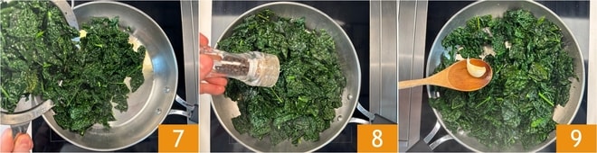 Ajoutez le chou bien égoutté 7, salez, poivrez 8 et faites-le revenir environ 10 minutes à feu moyen. Éteignez le feu, retirez l'ail 9 et laissez tiédir.