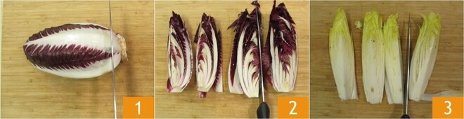 Pour réaliser la burrata avec légumes et fruits grillés, commencez par préparer les ingrédients : éliminez la base de la chicorée 1 et divisez-la en 4 quartiers dans le sens de la longueur 2. Faites de même avec l'endive belge 3.