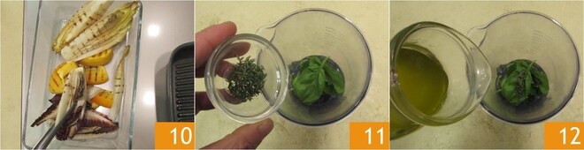 Mettez de côté les fruits et légumes grillés 10 et passez à l'assaisonnement : versez le basilic et le thym dans un récipient 11, puis ajoutez l'huile 12.