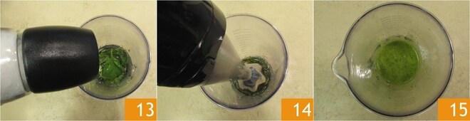 Salez 13, poivrez et mixez avec un mixeur plongeant 14 jusqu'à obtenir une consistance homogène 15.