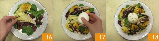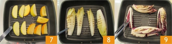 Disposez les fruits sur une grille bien chaude et faites-les griller de chaque côté pendant un total de 3-4 minutes 7. Grillez également l'endive belge 8 et la chicorée 9.