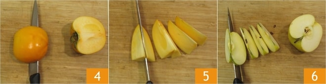 Coupez le kaki d'abord en deux 4 puis en quartiers, ensuite divisez chaque quartier encore en deux 5. Faites de même avec la pomme, sans retirer la peau 6.