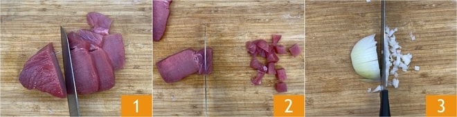 Pour réaliser les busiate au ragoût de thon, coupez le thon frais d'abord en tranches d'une épaisseur de 1,5-2 cm 1 puis en dés 2. Épluchez et hachez finement l'oignon 3.
