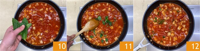 Salez, poivrez et aromatisez avec les feuilles de menthe émiettées à la main 10. Mélangez bien 11, baissez à nouveau le feu et laissez cuire pendant environ 30 minutes 12.