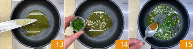 Entre-temps, occupez-vous de la muddica : dans une autre poêle, faites parfumer l'huile avec l'ail 13 et le persil 14 hachés finement. Ajoutez également le piment 15.
