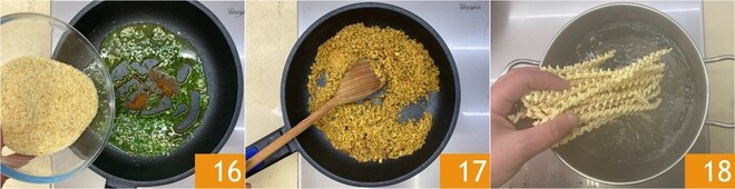 Versez la chapelure 16 et laissez dorer à feu modéré, en mélangeant souvent 17. Réservez la muddica et mettez sur le feu une casserole d'eau à saler pour ébullition. Quand la sauce sera prête, plongez les pâtes dans l'eau bouillante salée 18.