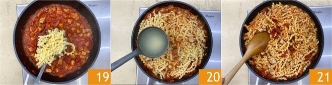 Égouttez les busiate très al dente et transférez-les dans la poêle avec l'assaisonnement 19. Terminez la cuisson des pâtes en vous aidant d'une louche de son eau de cuisson 20, en mélangeant bien pour tout amalgamer 21.