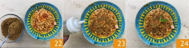 Dressez l'assiette et garnissez avec une abondante muddica 22, puis complétez le plat avec un filet d'huile à cru 23 et quelques feuilles de menthe fraîche : vos busiate au ragoût de thon sont prêtes à être servies 24 !