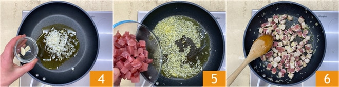 Faites chauffer l'huile dans une grande poêle antiadhésive, ajoutez ensuite l'oignon haché et les gousses d'ail entières 4 et faites revenir à feu moyen-doux jusqu'à ce que l'oignon devienne transparent. À ce stade, retirez l'ail et ajoutez les dés de thon 5. Faites revenir le thon à feu doux pendant 2-3 minutes, en essayant de le tourner délicatement sur tous les côtés pour éviter de le casser 6.