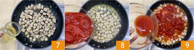 À ce stade, augmentez le feu et déglacez avec le vin blanc 7. Une fois évaporé, ajoutez les tomates pelées 8 et émiettez-les avec la louche, puis ajoutez un peu d'eau, juste assez pour rincer le bol 9. Ajoutez également le concentré de tomate.