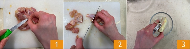 Pour préparer le poulet au beurre, commencez par prendre les cuisses et désossez-les 1, puis coupez-les en morceaux 2. Pelez le gingembre 3 et épluchez les gousses d'ail.