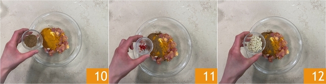 Assaisonnez avec le garam masala 10, le piment fort haché 11 et la pâte d'ail et de gingembre 12.