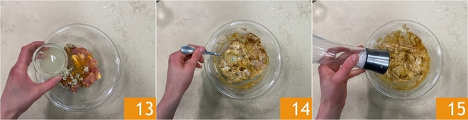 Versez le jus de citron 13 et mélangez bien 14. Enfin, salez 25 et mélangez à nouveau.