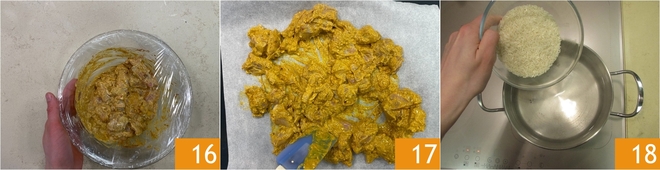 Couvrez de film plastique 16 et mettez au réfrigérateur pendant au moins 30 minutes ou jusqu'à 24 heures. Passé ce temps, préchauffez le four ventilé à 200°C. Disposez le poulet avec sa marinade sur une plaque recouverte de papier sulfurisé 17 et faites-le cuire pendant environ 30 minutes, jusqu'à ce qu'il soit doré. Pendant ce temps, faites cuire le riz basmati dans de l'eau bouillante 18 et préparez la sauce.