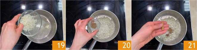 Pour préparer la sauce makhani, faites fondre le beurre dans une casserole à feu moyen. Ajoutez l'oignon haché 19 et faites-le revenir jusqu'à ce qu'il soit doré. Ajoutez les épices entières (cardamome, anis, cannelle, graines de cumin) 20 21 et faites-les griller pendant 1-2 minutes jusqu'à ce qu'elles libèrent leur arôme.