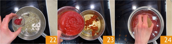 Ajoutez le concentré de tomate 22 et mélangez. Ensuite, ajoutez la purée de tomate 23 et ajustez l'assaisonnement. Si vous le souhaitez, vous pouvez également ajouter une pincée de sucre. Couvrez avec un couvercle 24 et laissez mijoter à feu doux pendant environ 20 minutes, jusqu'à ce que la sauce épaississe.