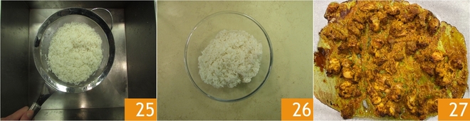 Une fois que le riz est cuit, égouttez-le 25 et réservez-le dans un bol 26. À ce stade, le poulet sera cuit, donc sortez-le du four 27.