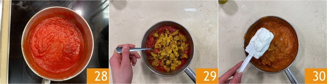 La sauce sera également prête 28, retirez les épices entières et ajoutez le poulet à l'intérieur 29. Poursuivez la cuisson à feu doux pendant encore 10 minutes, puis ajoutez la crème aigre petit à petit, hors du feu 30.