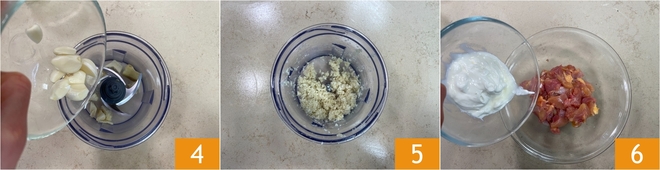 Mettez le gingembre et l'ail dans un mixeur 4 et mixez pour obtenir une pâte 5. Transférez le poulet en morceaux dans un grand bol et ajoutez le yaourt 6.