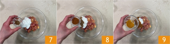 Ajoutez le cumin 7, le paprika doux 8 et le curcuma 9.