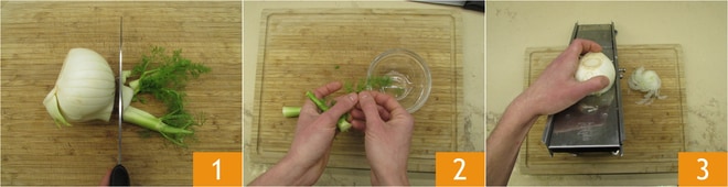 Pour réaliser le cabillaud à la poêle avec salade de fenouil et lardons, commencez par vous occuper des fenouils. Lavez les fenouils et retirez la base, coupez la partie avec les "plumets" en haut 1. Récupérez les petits plumets et gardez-les de côté dans un petit bol, ils vous serviront pour garnir la salade 2. À ce stade, commencez à couper les fenouils finement à l'aide d'une mandoline 3.