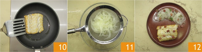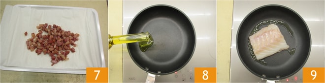 Mettez-les de côté 7, ils vous serviront pour terminer votre plat. Occupez-vous maintenant de la cuisson du morceau de cabillaud, dans une poêle antiadhésive bien chaude, versez un filet d'huile 8 et commencez à faire revenir votre cabillaud 9. Faites-le cuire d'un côté jusqu'à ce qu'il prenne une belle couleur dorée puis retournez-le et terminez la cuisson, cela prendra environ 6 minutes de chaque côté à feu moyen-vif.