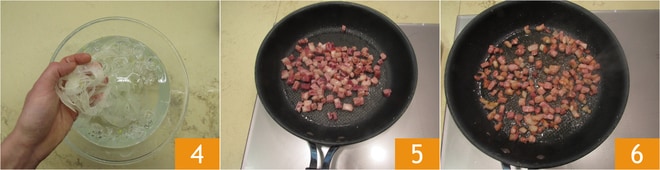 Mettez les fenouils dans un bol avec beaucoup d'eau et de glace 4, cette étape rendra les fenouils croquants et ils s'enrouleront légèrement. Faites maintenant revenir les lardons dans une poêle antiadhésive 5. Faites-les cuire jusqu'à ce qu'ils soient bien dorés et légèrement croquants 6.