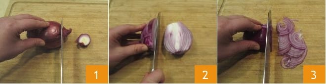 Pour préparer le cabillaud avec un concassé de tomates séchées, commencez par nettoyer l'oignon de Tropea: enlevez les extrémités 1 et la peau extérieure de l'oignon, puis coupez-le en deux 2 et enfin en tranches très fines 3.