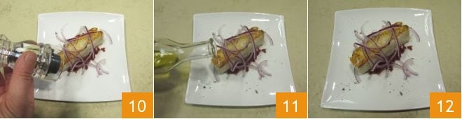 Une fois cuit, transférez le cabillaud dans les assiettes en le plaçant sur une base de tomates séchées hachées, puis ajoutez quelques tranches d'oignon cru, une pincée de poivre noir 10 et un filet d'huile crue 11: votre cabillaud avec un concassé de tomates séchées est prêt à être servi 12!