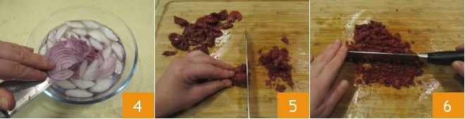 Transférez les tranches d'oignon dans un bol avec de l'eau et de la glace, de cette façon elle conservera son croquant 4. Prenez les tomates séchées à l'huile, égouttez-les et coupez-les en morceaux 5, puis hachez-les finement avec un couteau jusqu'à obtenir une purée 6.