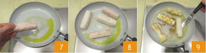Maintenant, versez l'huile dans une poêle antiadhésive et chauffez-la à feu moyen-élevé, puis réduisez légèrement la flamme et ajoutez le cabillaud 7: faites cuire environ 6 minutes sans le retourner, en faisant tourner la poêle pour bien répartir l'huile et éviter que les morceaux ne collent au fond 8. Passé ce temps, retournez délicatement le cabillaud avec une spatule et laissez-le cuire encore 6 minutes toujours à feu moyen 9. Pendant ce temps, égouttez l'oignon rouge et séchez-le avec du papier absorbant.