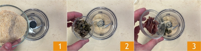 Pour préparer le cabillaud gratiné, commencez par verser dans un mixeur la chapelure 1, les câpres 2 et les anchois bien égouttés 3.