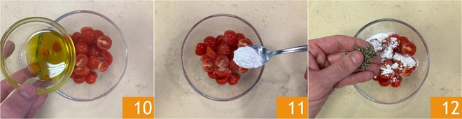 Transférez les tomates cerises dans un bol, assaisonnez-les avec de l'huile 10, du sucre glace 11, du sel et de l'origan 12.