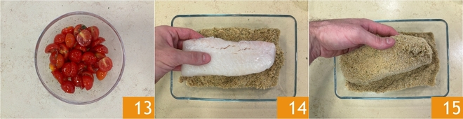 Mélangez bien 13. Passez maintenant le cabillaud dans la panure 14 de manière à bien enrober tous les côtés 15.