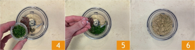 Ajoutez également la ciboulette hachée 4, une pincée de sel 5, un tour de poivre et mixez le tout 6.