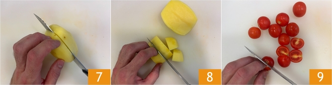 Réservez la panure et passez aux pommes de terre : épluchez-les et coupez-les d'abord en deux 7, puis en dés 8. Lavez et coupez également les tomates cerises en deux 9.