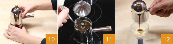 Vissez bien la cafetière 10 (pour éviter que le café ne sorte par les côtés pendant qu'il monte), puis placez-la sur une flamme basse et constante, pour obtenir un café corsé. Au fur et à mesure que le café monte, une mousse dense se formera 11; nous vous conseillons de ne pas laisser bouillonner trop longtemps le café, pour en préserver l'arôme et la douceur. Votre café est prêt : avant de le verser, mélangez-le directement dans la moka avec une cuillère pour le rendre plus homogène. Sortez les verres du réfrigérateur et complétez le tout en versant une tasse de café chaud (environ 40 ml) pour chacun 12 : le café à la cassata est prêt à être dégusté!
