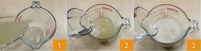 Préparer le café glacé aux glaçons d'amande est très simple. Commencez par verser le sirop de lait d'amande dans un récipient spacieux 1, puis ajoutez l'eau en filet pour le diluer (2 -3).