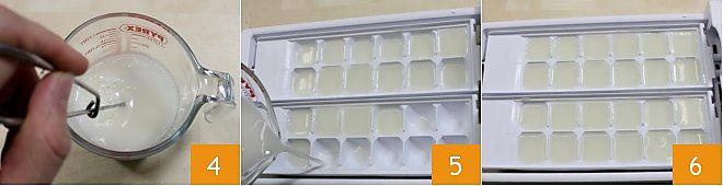 Mélangez les ingrédients jusqu'à obtenir un mélange homogène 4, puis transférez le mélange dans les moules à glaçons appropriés 5 en veillant à remplir chaque moule jusqu'au bord. Ensuite, placez délicatement les moules dans le congélateur et laissez congeler le mélange pendant au moins 3 heures, jusqu'à ce qu'il soit complètement gelé 6.