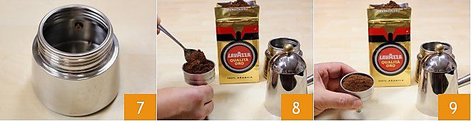 Une fois le temps écoulé, consacrez-vous à la préparation du café avec la moka : mettez de l'eau froide, de préférence pauvre en calcaire, à l'intérieur de la chaudière jusqu'à la soupape de sécurité 7 (sinon vous obtiendrez un café plus long). Remplissez le filtre avec le café moulu 8 et nivelez à chaque cuillère de café ajoutée en frappant le filtre sur la table avec des mouvements décidés 9, jusqu'à atteindre le bord du filtre.