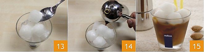 Démoulez les cubes de sirop de lait d'amande des moules et pour chaque petit verre tumbler bas, mettez 6 ou 7 cubes 13 et 50 ml de café en veillant à le verser près du bord et non sur les cubes de glace pour qu'ils restent blancs 14. Procédez de la même manière avec les autres petits verres. Vous aurez ainsi votre café glacé aux glaçons d'amande à déguster agréablement 15!