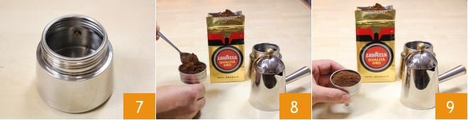 Préparez entre-temps le café avec la cafetière : pour obtenir un excellent café, remplissez la chaudière de votre cafetière avec de l'eau froide, de préférence pauvre en calcaire, en veillant bien à ne pas dépasser la soupape de sécurité 7 (sinon vous obtiendrez un café plus long). Remplissez le filtre avec le café moulu en formant une petite montagne que vous nivellerez en tapant le filtre sur la table avec des mouvements fermes (8-9). Ne pressez pas avec la cuillère, ni ne percez la surface.