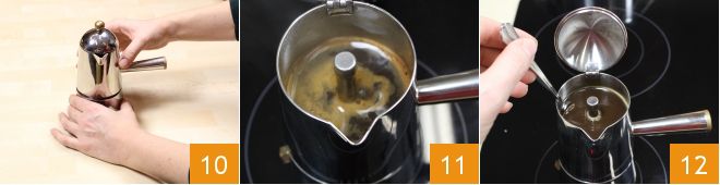 Fermez très fermement la cafetière 10, afin que le café ne s'échappe pas sur les côtés en montant, et posez-la sur une flamme basse et constante pour obtenir un café corsé. Au fur et à mesure que le café monte, une mousse dense se formera 11 : nous vous conseillons de ne pas laisser le café bouillir trop longtemps pour maintenir intacte sa douceur et son arôme. Votre café est prêt : avant de l'utiliser, mélangez-le directement dans la moka avec une cuillère pour rendre le café plus homogène 12.