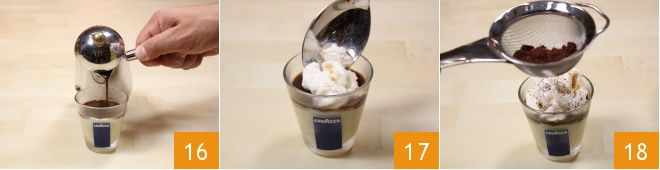 Versez le café chaud jusqu'à recouvrir complètement la crème 16. Décorez le verre avec une bonne cuillère de meringues émiettées 17 et une pincée de cacao amer 18. Voici votre café meringué prêt!