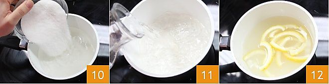 Maintenant, versez le sucre dans une autre petite casserole 10 et ajoutez l'eau 11. Ajoutez les zestes de citron que vous avez blanchis 12 et faites-les cuire pendant environ 60 minutes à feu très doux dans le sirop d'eau et de sucre.