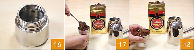 Pour préparer le café frappé au citron, commencez par le café. Pour obtenir un excellent café, remplissez la chaudière de votre moka avec de l'eau froide et si possible pauvre en calcaire, en faisant attention à ne pas dépasser la soupape de sécurité 16 (sinon vous obtiendrez un café plus long). Remplissez le filtre avec le café moulu en formant un monticule que vous nivellerez en frappant le filtre sur la table avec des mouvements fermes 17. Ne tassez pas avec la cuillère, ni ne percez la surface 18.