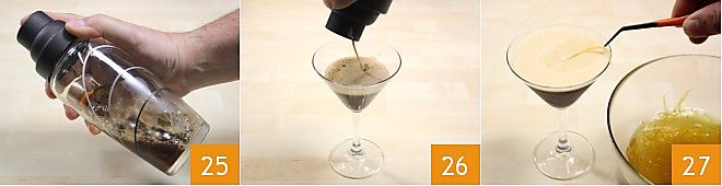 Maintenant, secouez bien et vigoureusement 25. Versez le café dans une coupe martini 26 : si vous avez bien secoué, vous obtiendrez 1 cm de mousse. Une fois garni de zestes 27, votre café frappé au citron est prêt à être servi et dégusté avec les écorces de citron confites !