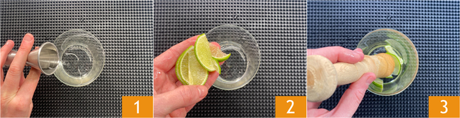 Pour préparer la caipiroska à la fraise, versez le sirop de sucre dans un verre old fashioned 1, puis ajoutez les tranches de citron vert 2 et pressez délicatement avec un pilon 3.