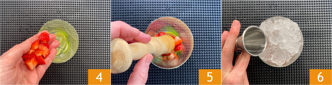 Ajoutez la fraise coupée en dés 4 et pressez à nouveau 5. À ce stade, remplissez le verre avec de la glace pilée et ajoutez la vodka 6.