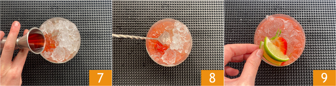 Ajoutez également la liqueur de fraise 7 et mélangez délicatement avec un stirrer 8. Si le niveau de la glace a baissé, ajoutez plus de glace pilée. Garnissez avec des tranches de citron vert et de fraises 9. Votre caipiroska à la fraise est prête à être dégustée!